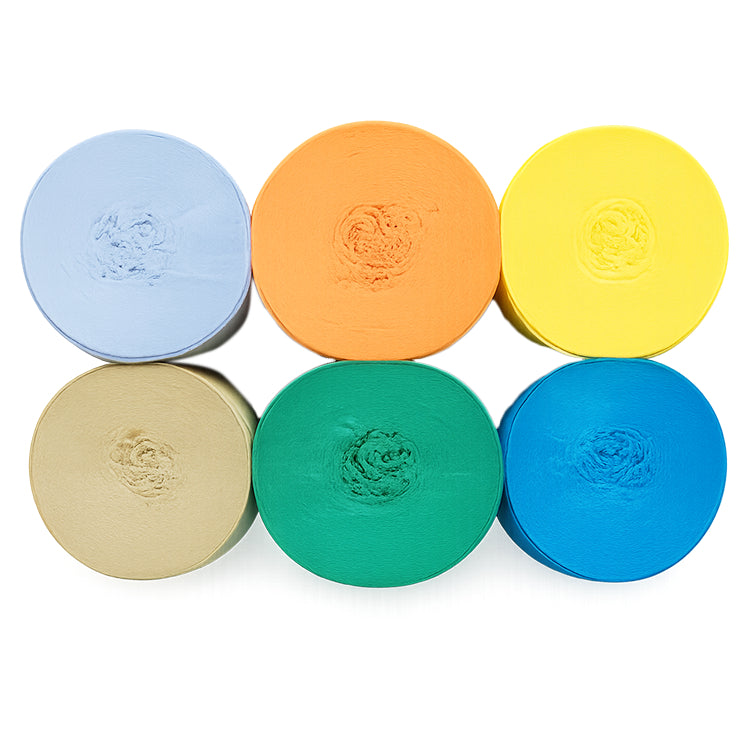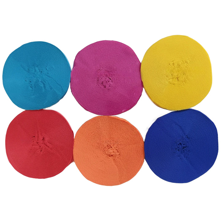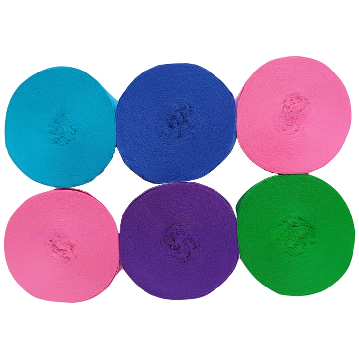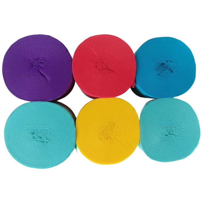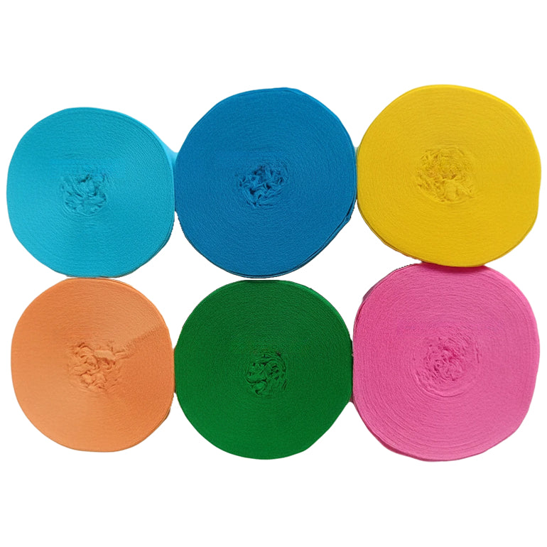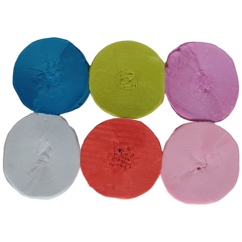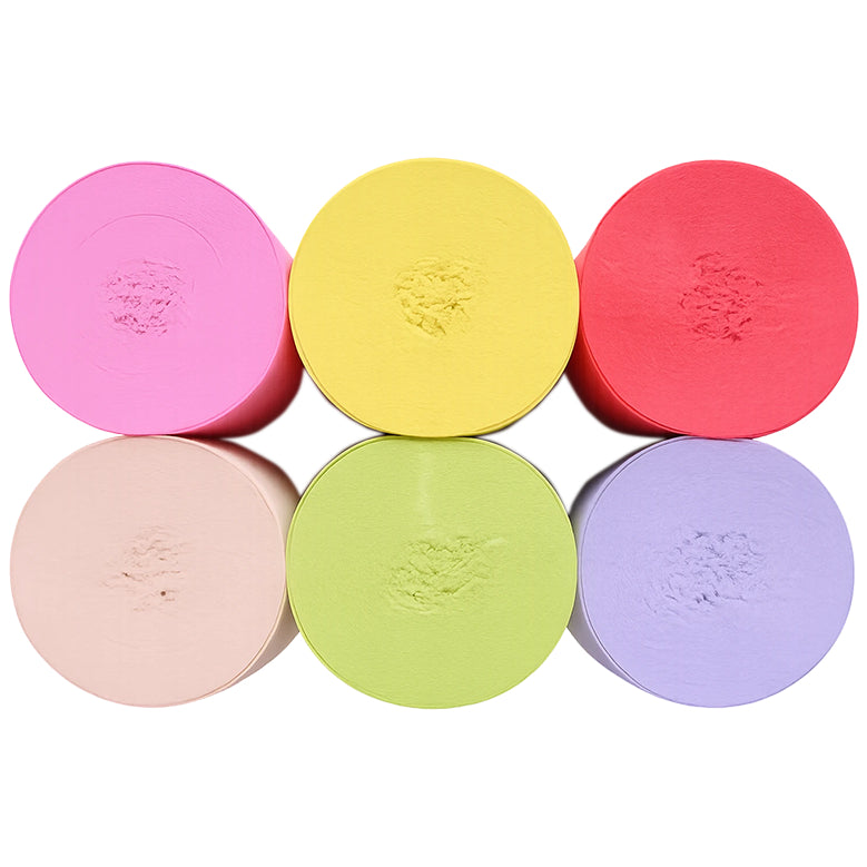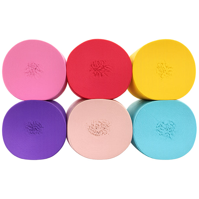 This 6-pack crepe paper streamer set features six rolls measuring 82 feet each for a total length of 492 feet, with a 1.77 inch width ideal for birthday, wedding, baby shower, theme party, and event decorations. Crafted from thick crepe paper with a sturdy texture, the streamers provide dependable hanging strength and a smooth decorative finish. The pre-rolled design allows easy use for ceiling displays, spiral accents, backdrops, and room styling, adding vibrant color to party spaces. Suitable for party decor, DIY crafts, and art projects, the streamers pair well with other decorations; handle gently to prevent over-pulling.