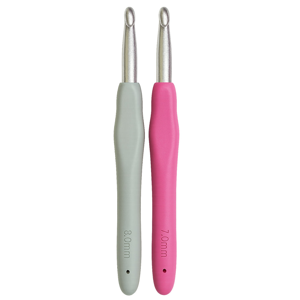 This two piece crochet hook set features soft, ergonomic rubber handles paired with sturdy aluminum hooks and is available in sizes from 1.0 mm to 15 mm, making it suitable for both new and experienced crafters. The cushioned grip is shaped to reduce hand fatigue, allowing for more comfortable and controlled stitching during longer projects. Each hook has a smooth finish that moves easily through yarn, helping to avoid snagging or splitting. A solid metal core runs the full length of the handle to keep the hook secure and prevent separation, offering dependable strength for a variety of crochet and craft applications.